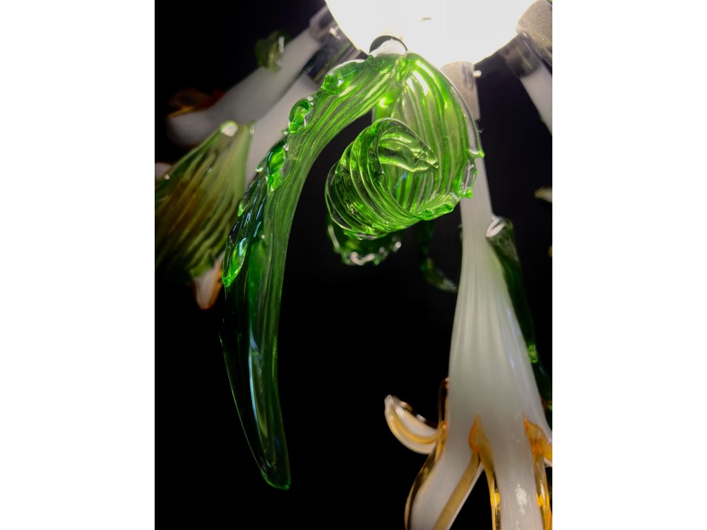 Centrální stínítko - bílé sklo, 10 skleněných květů lilie, 6 zelených listů