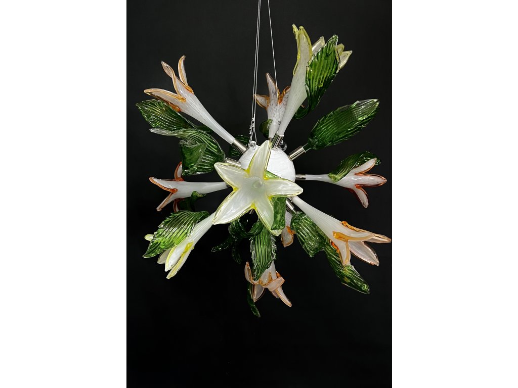 Centrální stínítko - bílé sklo, 10 skleněných květů lilie, 6 zelených listů